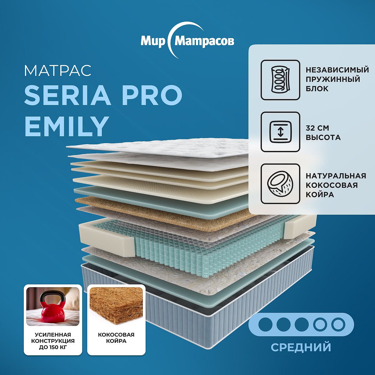Матрас «Мир матрасов Emily» — средней жесткости, которая комфортна большинству людей среднего телосложения. Это — оптимальный вариант и детям, и взрослым, и пожилым людям.