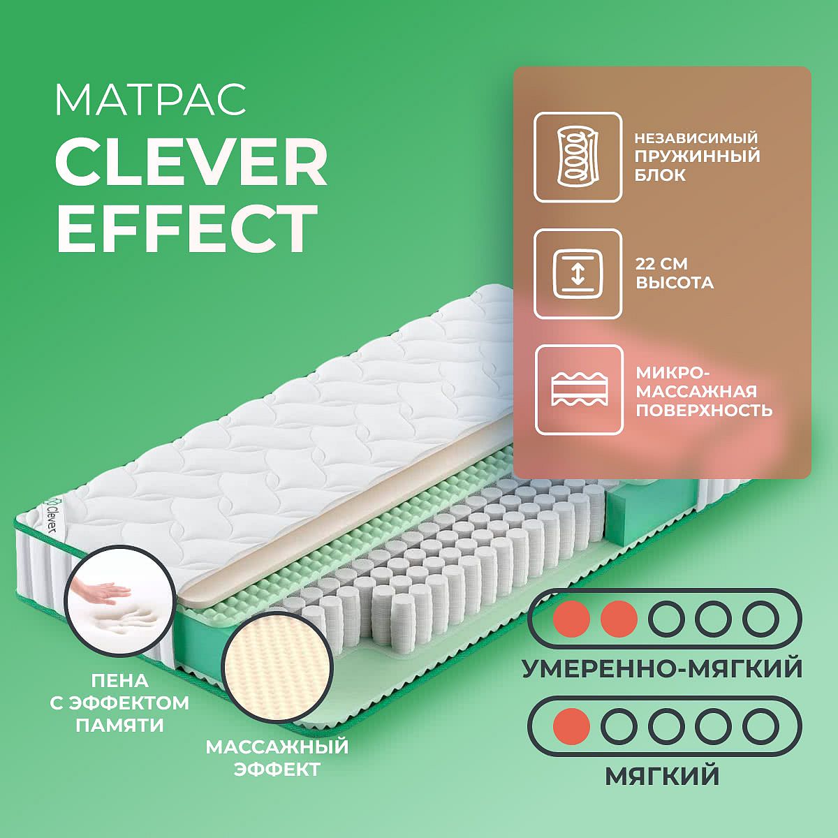 Нагрузка на спальное место, кг: 100. Высота, см: 22. Матрас скручен в рулон. Базовая основа матраса Effect от бренда Clever представляет собой блок независимых пружин TFK, который содержит 500 пружин на каждое спальное место. Ход пружин в таком блоке не зависим друг от друга — сжимаются только те пружины, на которых идет непосредственная нагрузка. Таким образом, достигается правильная поддержка человеческого тела во время сна и отдыха. Матрас двусторонний, с одной стороны очень мягкий, а с другой стороны умеренно мягкий. Мягкая сторона эффект памяти формы. А это значит, что материал Меморикс, которым выложена сторона подстраивается под рельеф человеческого тела и не пытается выпрямиться, делая сон максимально комфортным и удобным. Также мягкая сторона имеет слабо выраженный массажный эффект за счет использования пенополиуретана с рельефным рисунком. Умеренно-мягкая сторона представлена только массажным слоем — за счет специальной ячеистой нарезки поверхность матраса точечно воздействует на тело, помогая телу расслабиться. Отдых на такой поверхности способствует снятию напряжения.