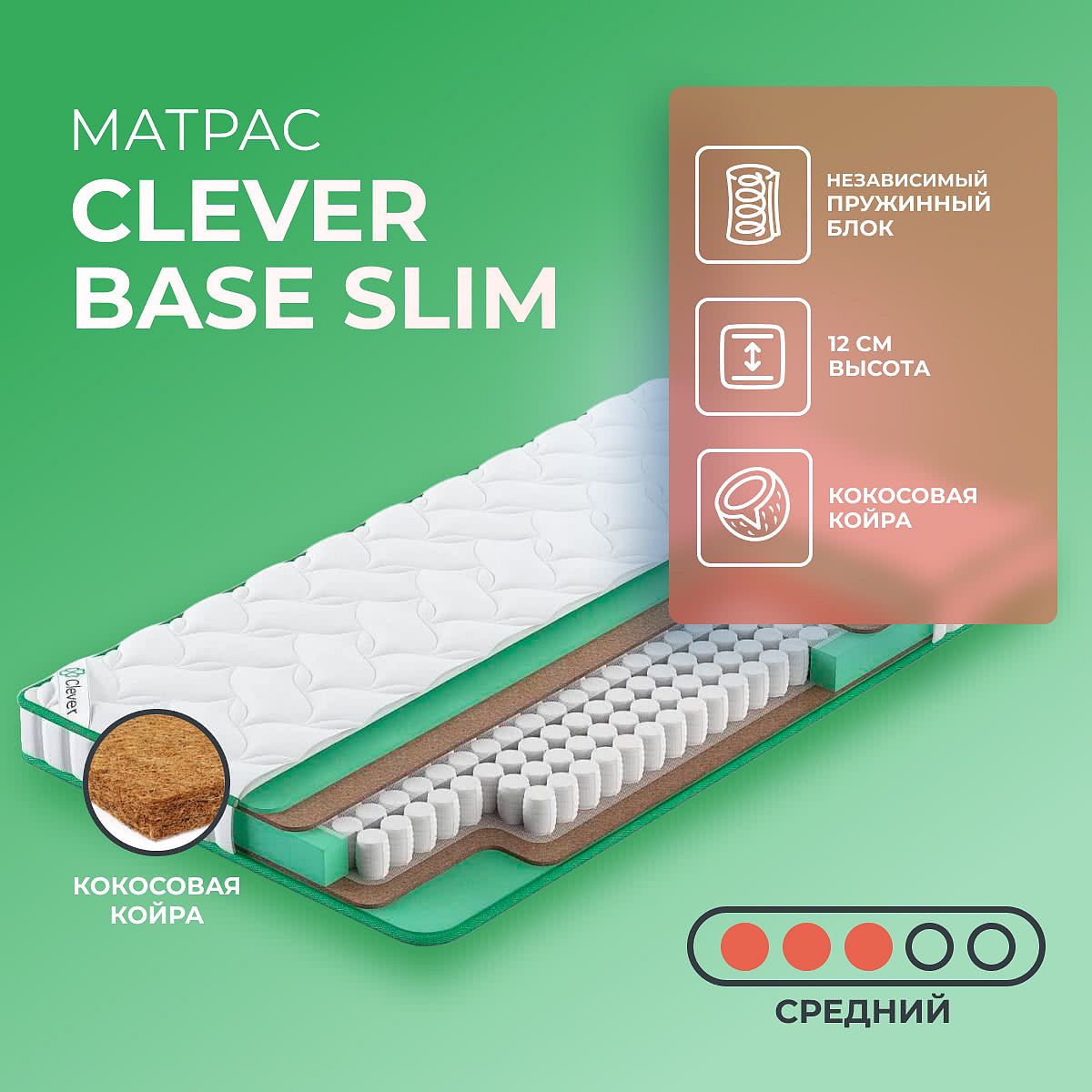 Матрас «Clever Base Slim» — средней жесткости, которая подходит большинству людей среднего телосложения. Это — универсальный вариант и детям, и взрослым, и пожилым людям.