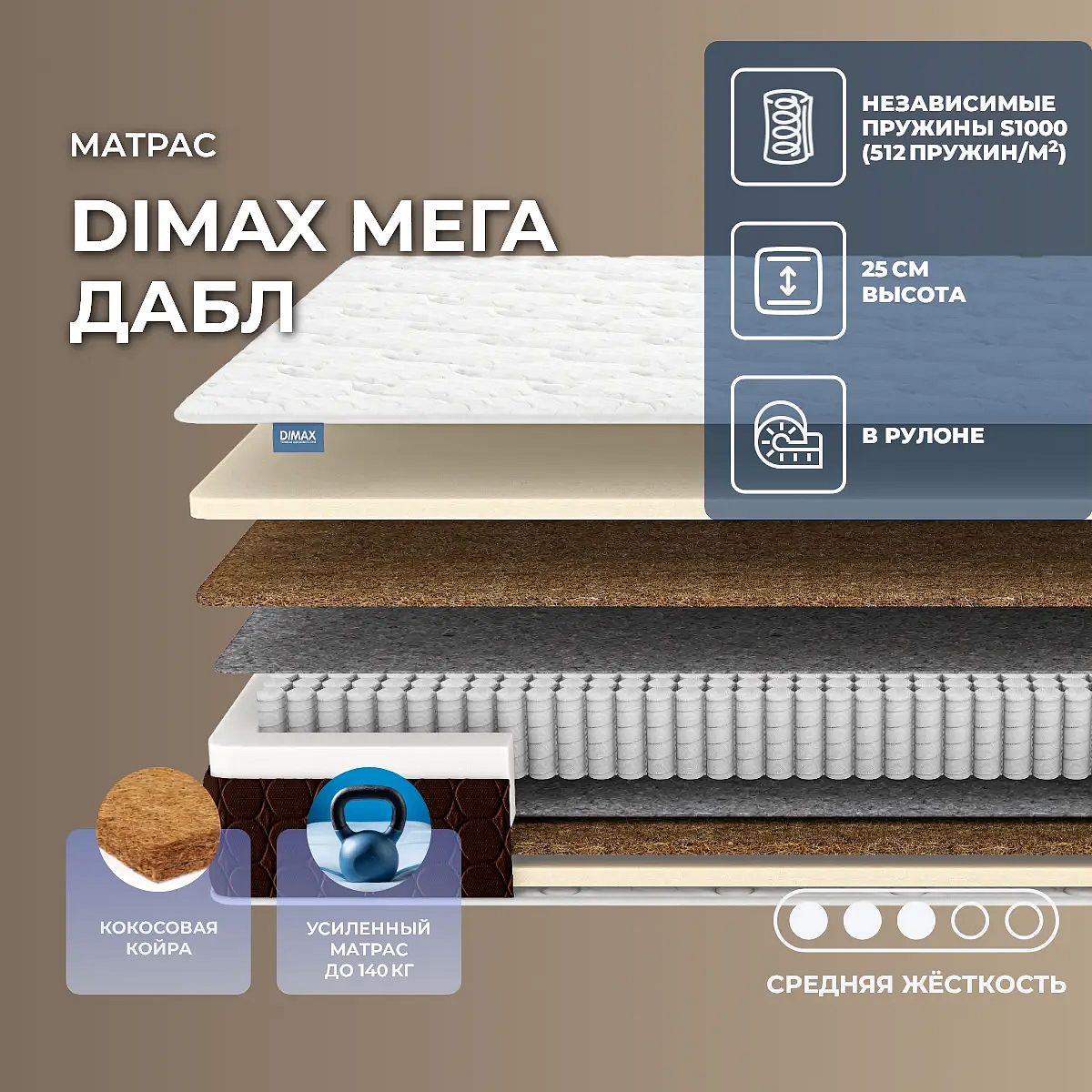 Кокос — натуральный материал, койра отлично дышит, придает матрасу «Мега Дабл» жесткость и упругость.