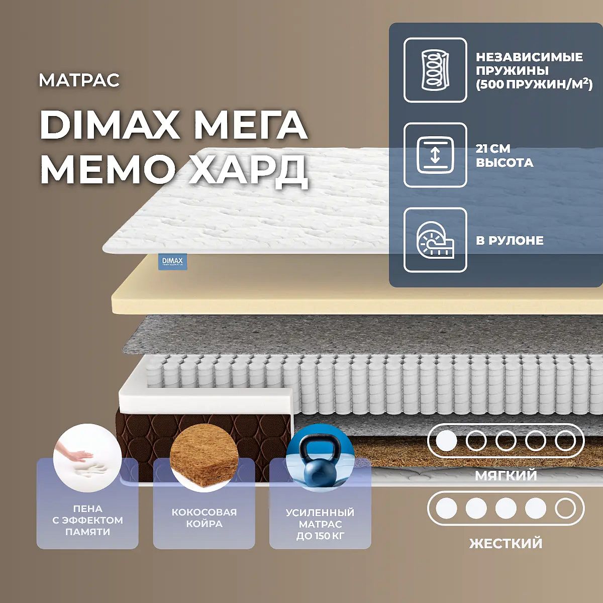 Уровень жесткости: низкий/высокий. Две разножесткие стороны на пружинахМодель имеет двустороннее наполнение и базируется на пружинном блоке S1000. Ее можно переворачивать и, таким образом, можно изменять жесткость спального места.Упругая поддержка для телаС одной стороны проложен современный наполнитель с мегаупругой структурой – мемориформ. Он максимально точно подстраивается и повторяет все контуры тела и под воздействием температуры может запоминать их. Когда человек встает с такой поверхности, то может увидеть, что на ней образовался отпечаток его тела. Мемориформ обеспечивает максимальное расслабление, он хорошо вентилируется и имеет долгий эксплуатационный срок.Полезное действие кокосаС другой стороны проложен наполнитель кокосовая койра. Это природный материал, который получают из ореха кокосовой пальмы. Волокна его жесткие и сухие, для скрепления их используется млечный сок дерева Гевея. Получается достаточно упругий и прочный наполнитель с хорошими воздухопроницаемыми свойствами. Он отлично вентилируется и создает надежную поддержку для позвоночника.Действие пружин S1000Независимый пружинный блок S1000 – это надежная основа из 1000 микропружин, по 500 на 1 кв. метр. Пружины изолированы друг от друга и помещены в чехлы. Нагрузка в такой конструкции распределяется равномерно, пружины воздействуют точечно и создается благоприятный микроклимат на поверхности. По периметру такой блок усилен слоями пенополиуретана.Чехол из трикотажаЧехол выполнен из мягкого трикотажа и получил дополнительный объем за счёт высокой стежки по ППУ и холлкону. В результате использования сразу двух наполнителей создается красивый рельефный узор на спальной поверхности.Боковая часть изготовлена из тёмно-коричневой мебельной ткани с простёжкой по ППУ. Контрастный цвет материала добавляет матрасу элегантности и стильности. Обивка обеспечивает высокую износостойкость и долговечность, что позволяет сохранить привлекательный внешний вид матраса на долгие годы. Рекомендованная нагрузка – до 150 кг на спальное место, высота спальной принадлежности – 21 см. Защита матрасаДля защиты поверхности от пятен от пролитых жидкостей, грязи и пыли рекомендуем купить дополнительно защитный чехол или водонепроницаемый наматрасник.Другие моделиПосмотрите также другие модели этой серии: Dimax Мега Медиум Мемо, Dimax Мега Мемо Софт.Скрутка в рулонПо умолчанию матрас поставляется в развернутом виде. По вашему желанию матрас может быть доставлен в скрученном виде.При доставке транспортной компанией матрас всегда скручивается в рулон. Хранение матрасов в скрутке должно осуществляться: