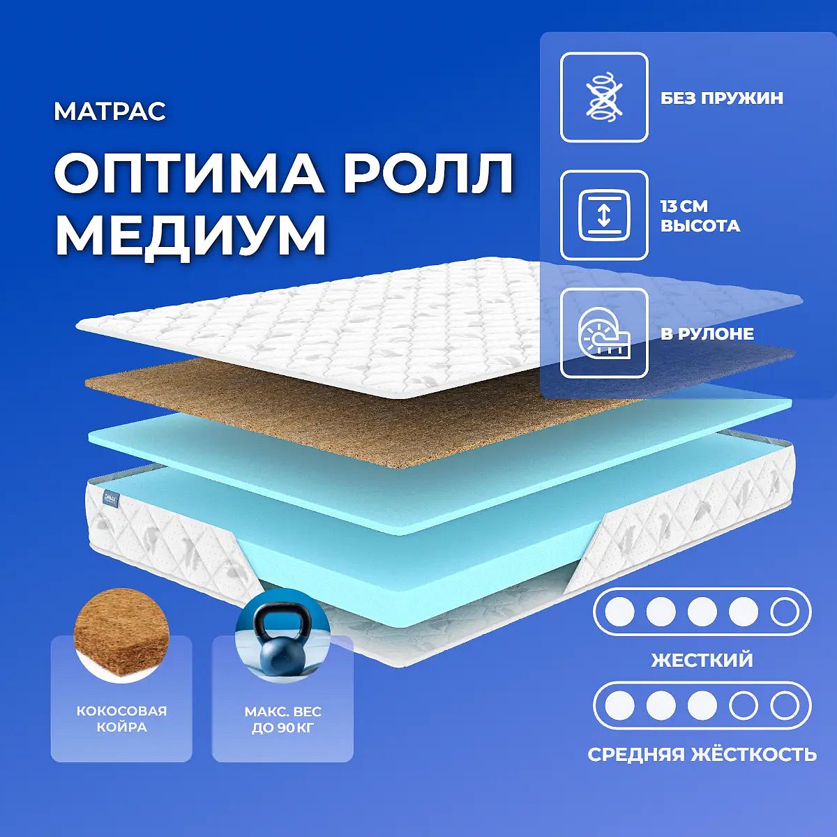 Матрас Dimax Оптима Ролл Медиум — это беспружинная модель для комфортного сна с разной степенью жесткости сторон. Одна сторона матраса выполнена с прослойкой кокосовой койры, обеспечивающей жесткую поддержку, вторая — на основе эластичного пенополиуретана, что делает поверхность средней по жесткости. Такой матрас подойдет тем, кто ценит возможность выбора между более упругой и мягкой поверхностью для сна. Высота матраса составляет 13 см, а максимальная нагрузка на одно спальное место — до 90 кг. Чехол из трикота простеган на синтепоне, что придает дополнительную мягкость и аккуратный внешний вид. Матрас поставляется в рулоне — это удобно для транспортировки и сохранения свежести изделия. Характеристики