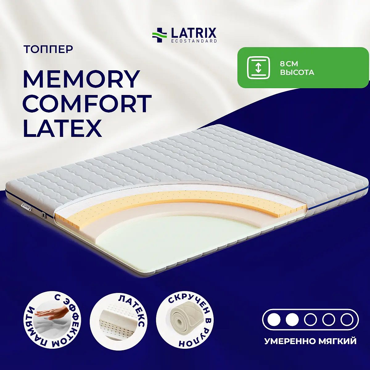 Уровень жесткости: ниже среднего / ниже среднего.Наполнитель: натуральный латекс – 2 см, пена Flexfoam – 3 см, пена с эффектом памяти – 2 см. Съемный чехол: трикотаж Tamzara. Высота, см: 8. Поставляется в скрученном виде. Дополнительно можно бесплатно заказать резинки для крепления на матрас. При этом необходимо указать высоту матраса для которого заказываете топпер с резинками.