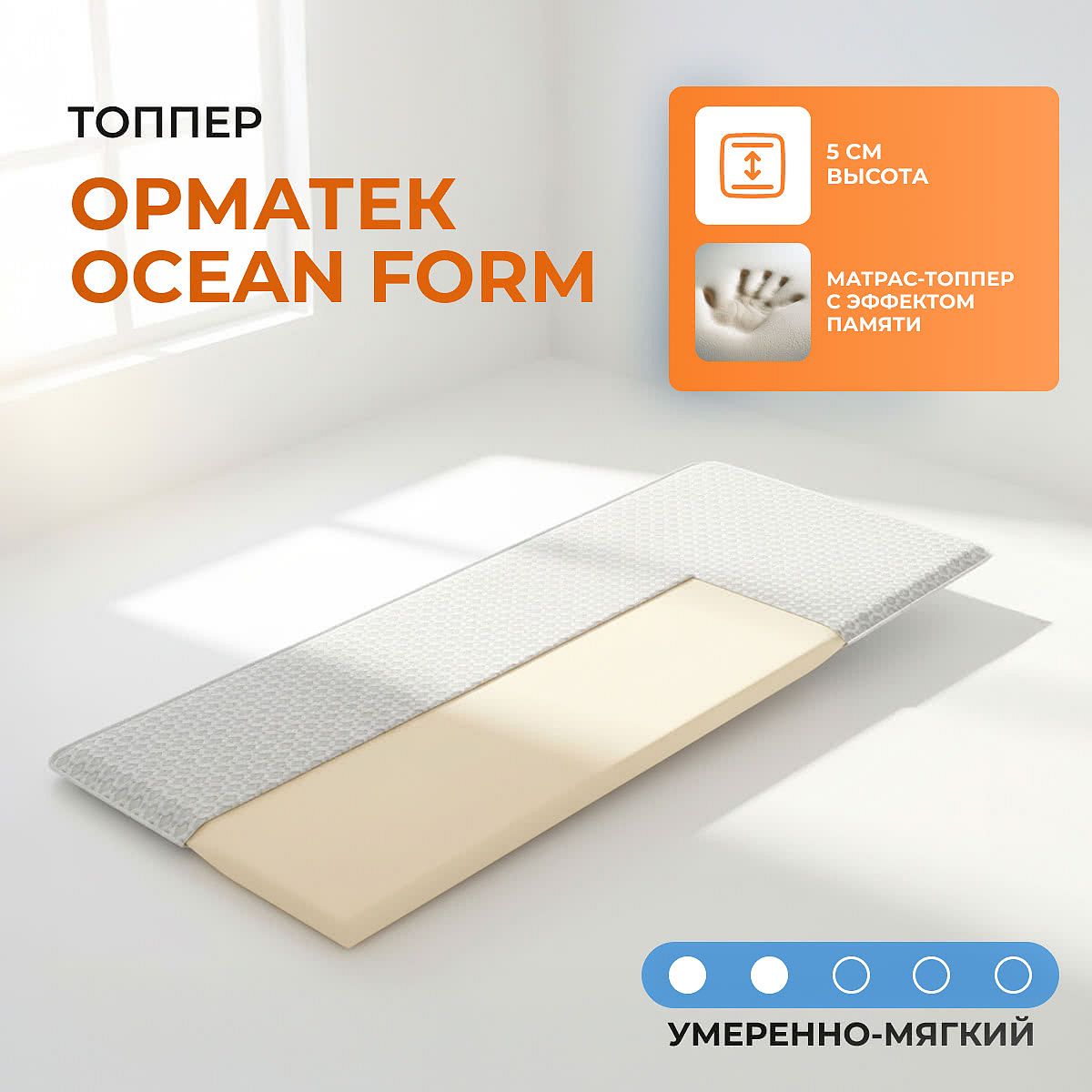 Топпер Орматек Ocean Form — это тонкий матрас для повышения комфорта вашего спального места. Благодаря материалу Memorix с эффектом памяти, топпер мягко подстраивается под контуры тела, снижая жесткость основного матраса и создавая ощущение расслабления. Умеренно мягкая поддержка обеспечивает приятные ощущения во время сна и подходит для ежедневного использования. Чехол Breeze Light выполнен из приятного трикотажа, а нижняя часть дополнена объемной 3D-сеткой для сквозной вентиляции, что помогает поддерживать свежесть матраса. Топпер легко фиксируется на кровати с помощью четырёх эластичных резинок, не скользит и сохраняет аккуратный внешний вид. Свойства