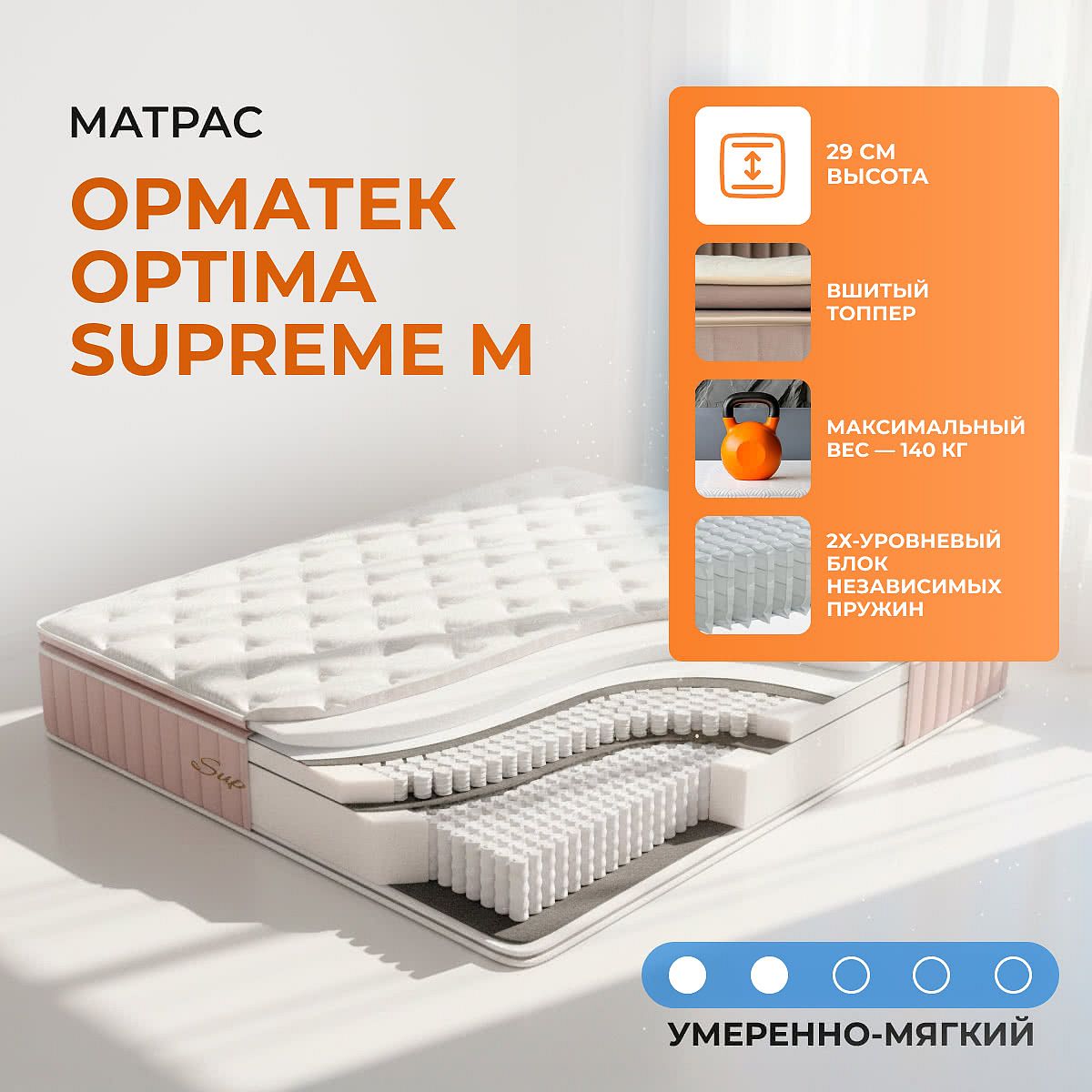 Матрас Орматек Optima Supreme M — это односторонний пружинный матрас с системой комфорта Pillow top, разработанный для тех, кто ценит мягкость, поддержку и современный подход к организации сна. Благодаря высоте 29 см, матрас создает ощущение уюта и расслабления, сравнимое с отдыхом в отеле высокого класса. Умеренно-мягкая поверхность и продуманная конструкция позволяют быстро расслабиться и чувствовать комфорт каждую ночь. Система двухуровневых независимых пружин (510 шт./м2) обеспечивает точечную поддержку и анатомическую адаптацию к изгибам тела. Это особенно важно для тех, кто хочет снизить мышечное напряжение и заботится о правильном положении позвоночника во время сна. Усиленный периметр Edge Support повышает устойчивость по краям, облегчает вставание и увеличивает срок службы матраса. Характеристики
