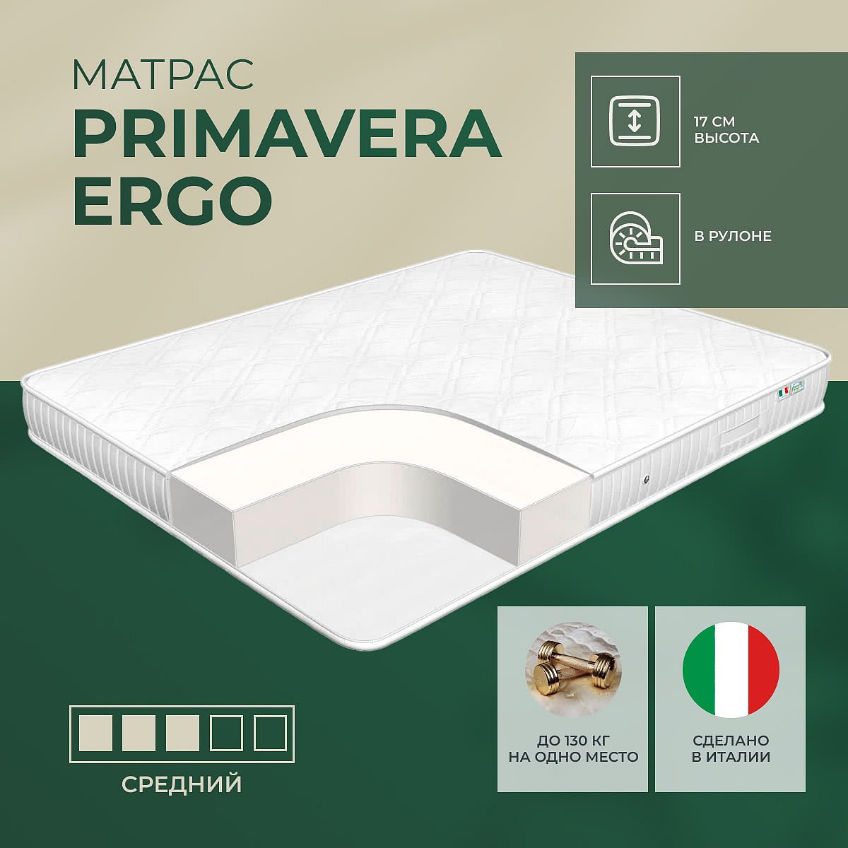 Матрас «Primavera Ergo» — средней жесткости, которая подходит большинству людей среднего телосложения. Это — оптимальный выбор и детям, и взрослым, и пожилым людям.