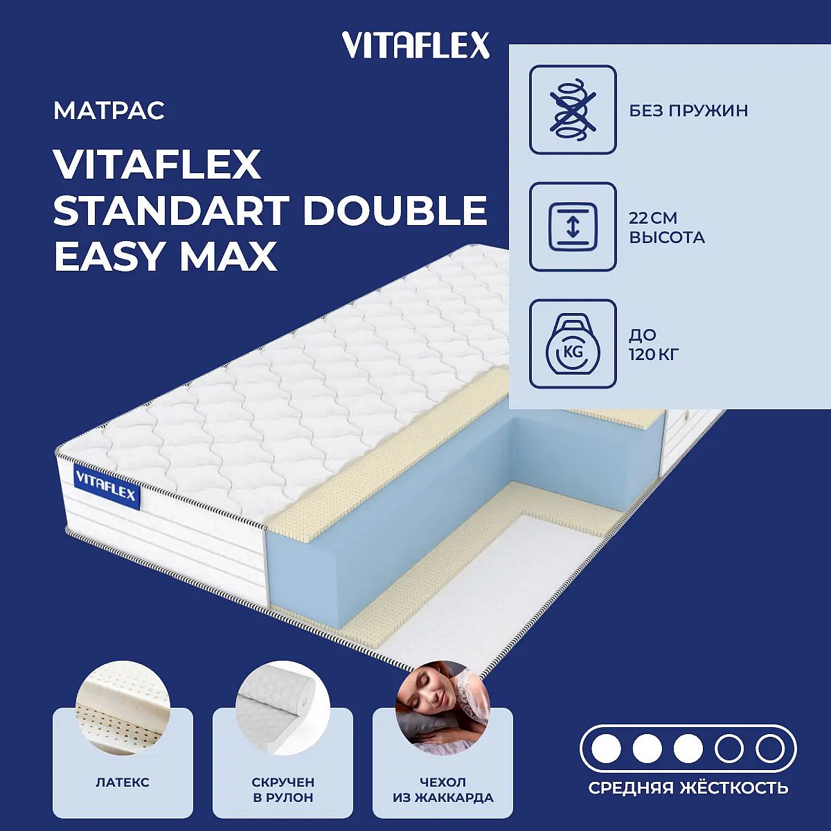 Матрас «Vitaflex Standart Double Easy Max» — средней жесткости, которая комфортна большинству людей среднего телосложения. Это — универсальный вариант и детям, и взрослым, и пожилым людям.