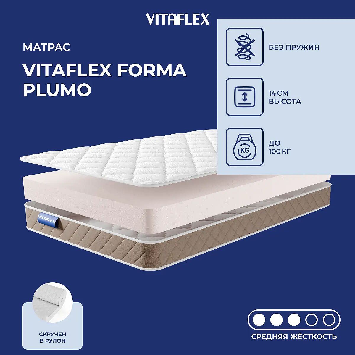 Матрас Vitaflex Forma Plumo — это беспружинный матрас средней жесткости, созданный для ежедневного комфортного сна. Подходит для тех, кто ценит умеренную поддержку и ощущение мягкости без излишней жёсткости. Высота матраса — 14 см, что обеспечивает удобную посадку на кровати и универсальное применение. В основе — монолитный слой искусственного латекса толщиной 14 см. Этот материал отличается хорошей упругостью, быстро восстанавливает форму после нагрузки и долго сохраняет свои свойства. Искусственный латекс подходит для чувствительных людей, поскольку почти не имеет запаха и не вызывает раздражения. Чехол выполнен из приятной на ощупь микрофибры с аккуратной стёжкой на синтепоне (100 г), что придаёт дополнительную мягкость поверхности и помогает сохранять тепло. Коричневый бурлет по периметру добавляет матрасу аккуратный внешний вид. Чехол несъёмный. Свойства и характеристики