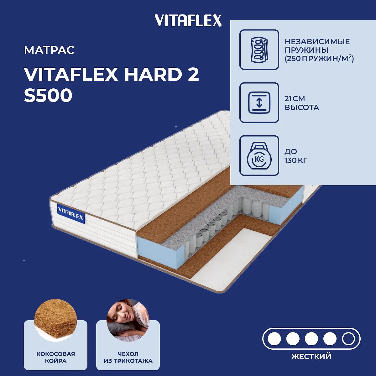 Матрас высокой жесткости «Vitaflex Hard 2 S500» — оптимальный выбор для уверенной поддержки позвоночника. Именно такие модели обычно рекомендуют подросткам, спортсменам или людям с проблемами позвоночника.