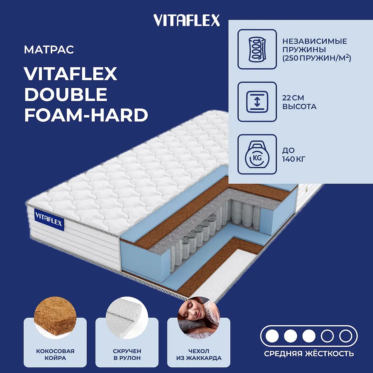Матрас «Vitaflex Double Foam-Hard» — средней жесткости, которая подходит большинству людей среднего телосложения. Это — оптимальный выбор и детям, и взрослым, и пожилым людям.